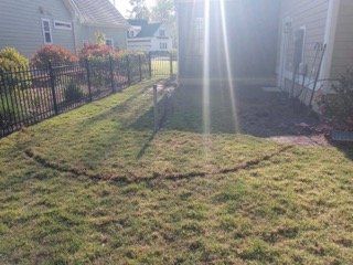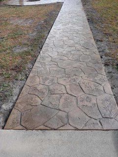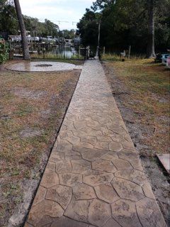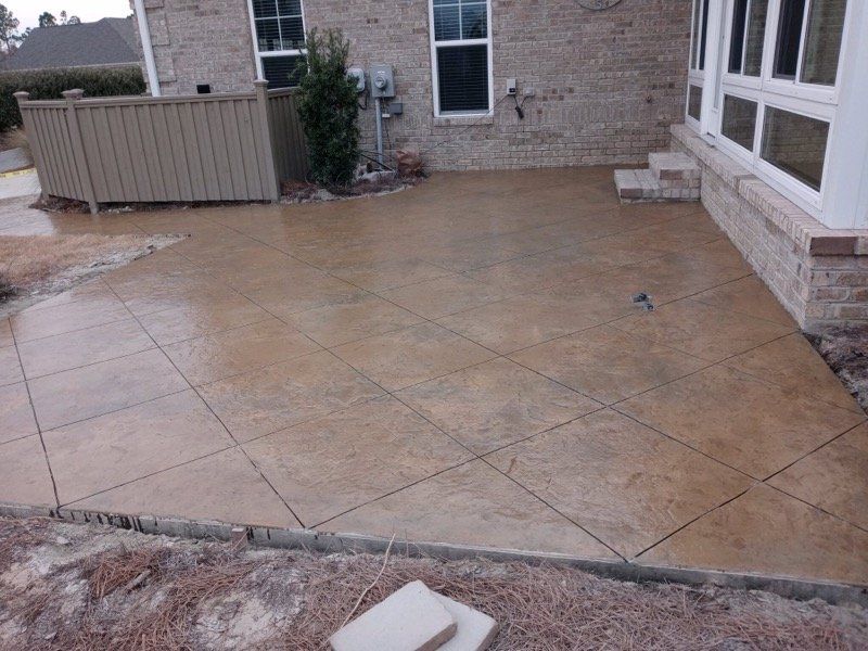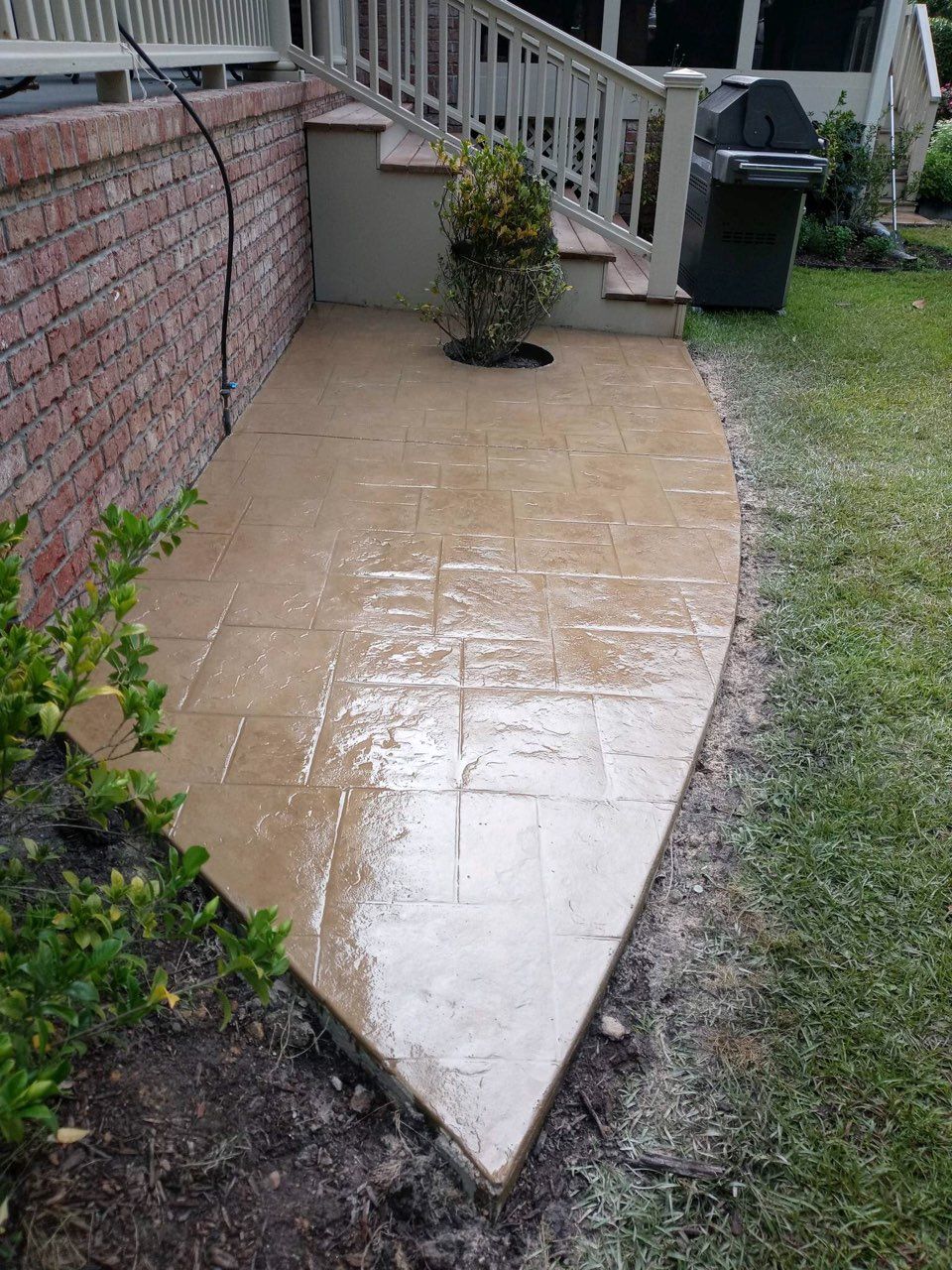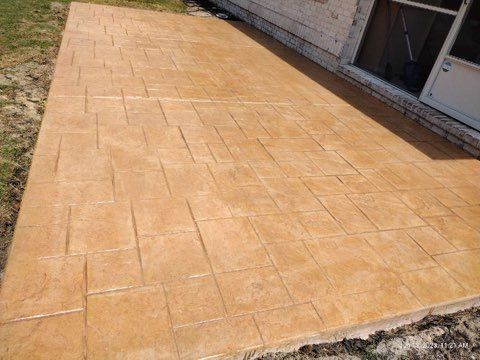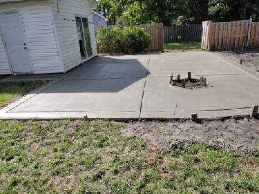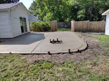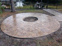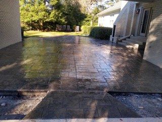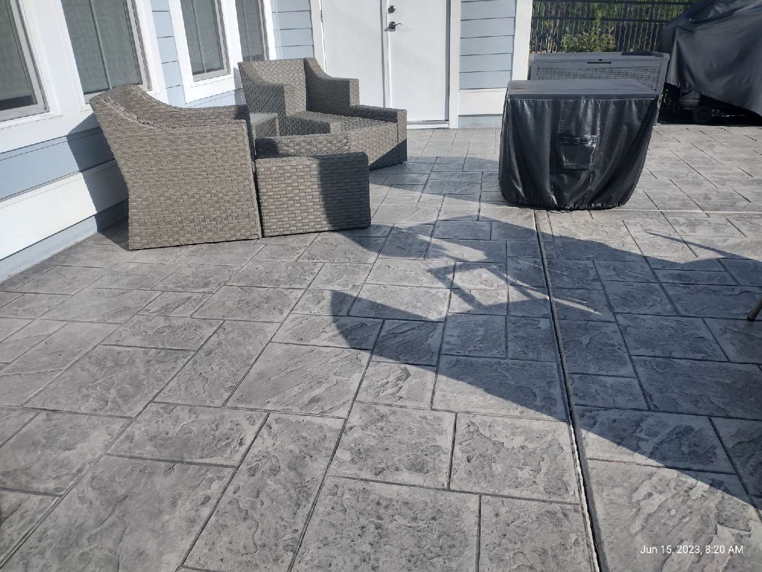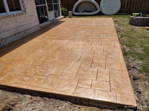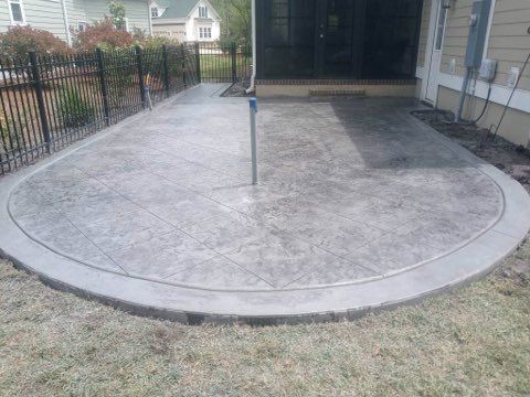 Potential client's will ask us if we can demo and remove old plain concrete, and give them a new design and look to enhance their yard. Above, you will see a photo on a standard concrete patio. We removed this patio, and poured new stamped concrete with a decorative coloring to beautify their living space!